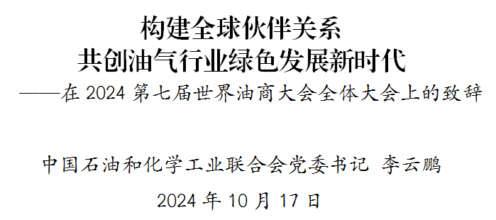 非常高兴在金秋十月和大家共聚美丽的千岛之城舟山。首先,我谨代表中国石油和化学工业联合会,向第七届世界油商大会的召开表示热烈的祝贺!油气产业是全球能源产业的重要组成部分。中国油气行业立足国情,全面推进供给侧结构性改革,大力增强国内资源生产保障能力,持续增加有效供给。2023年,国内油气当量产量超过3.9亿吨,连续7年保持千万吨级的快速增长,国内原油长期稳产2亿吨左右,天然气产量连续7年保持百亿立方米增产势头。同时,中国积极转变包括油气利用在内的能源消费方式,大幅提升能源利用效率,以年均约3.3%的能源消费增长支撑了年均超过6%的国民经济增长。中国油气行业坚决落实习近平总书记“把能源饭碗牢牢端在自己手中”的重要指示精神,为保障能源安全作出了重要贡献。中国经济社会发展已进入以绿色低碳为重要特征的高质量发展阶段。党的二十届三中全会对进一步全面深化改革、推进中国式现代化作出了重要部署,油气行业需要结合自身实际,大力推进清洁高效利用,努力降低油气产品全生命周期碳排放强度。今年8月,国务院《中国的能源转型》白皮书再次强调“要加快构建能源供给新体系,促进传统能源和新能源协同发展”。目前,中国油气行业正在推进可再生能源大规模高效制取绿氢、绿甲醇、绿氨等技术和装备研究,因地制宜布局油气行业与绿电、绿氢、绿甲醇、绿氨耦合发展的重大项目,努力拓展绿色船用燃料、绿色航空燃料等应用场景。以中国石油、中国石化、中国海油为代表的行业企业已经在相关核心技术的研发创新方面取得了重要突破,建设和运行了多个示范项目,有力推动着能源绿色低碳转型和应对气候变化工作。中国油气行业需要更加积极主动的深化全球能源合作,务实推进高水平对外开放。今年大会的主题是“构建全球大宗商品合作伙伴关系”,充分体现了能源安全战略中“一个合作”的具体要求。舟山自贸试验区作为中国唯一一个以油气全产业链建设为中心的自贸区,已成为全球石油行业交流合作的重要枢纽点。舟山打造出了集炼油、化工、高端新材料于一体的完整产业链,积极推进绿色船燃的基础设施建设,在去年相继完成了首单国际航行船舶保税LNG加注和国内首单国际航行集装箱船舶海上锚地生物燃料油加注。我看到今天与会的不仅有中国石油、中国石化、埃克森美孚、沙特阿美等国际大型油气公司,还有与油气相关的交易、金融、信息、航运等领域的国内外企业参与,我相信今天的会议可以进一步加强国内外、行业上下游之间的交流,提升舟山以油气为核心的大宗商品全球配置能力,为中国油气行业高质量发展和世界油气产业贡献力量。女士们、先生们,朋友们,习近平总书记指出,“合作才能办成大事,办成好事,办成长久之事”,石化联合会将充分发挥平台作用,以到位服务+专业素养的“店小二”的精神状态,用心用情做好服务工作,助力油气企业深化产业链上下游之间加强合作,携手构建团结、平等、均衡、普惠的全球发展伙伴关系,为促进全球油气行业绿色发展作出新的更大贡献!
