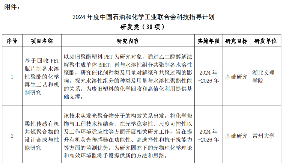 中国石油和化学工业联合会自2011年启动编制“中国石油和化学工业联合会科技指导计划”以来,得到了国家有关部门的高度认可,受到行业内企事业单位和产学研各界广泛关注。为了深入贯彻创新驱动发展战略,推动行业关键技术研发和科技成果转化,促进新技术产业化和规模化应用,我联合会于2024年2月启动了2024年的科技指导计划项目征集工作。经筛选和评审,共有38个项目列入计划,其中研发类30项,推广类8项。现将《2024年度中国石油和化学工业联合会科技指导计划》印发给你们,请认真组织实施。附件:2024年度中国石油和化学工业联合会科技指导计划
