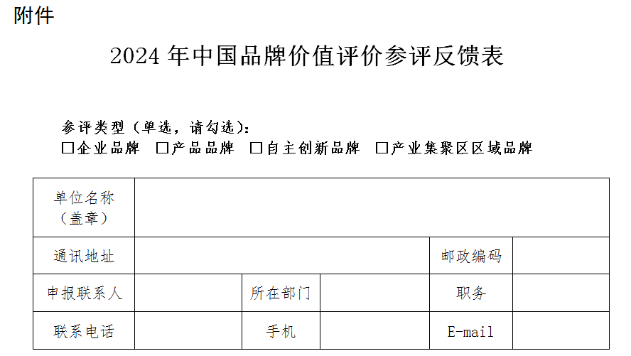31281-2014)等品牌评价相关标准。对品牌价值评价较高、品牌发展潜力较大的优秀品牌,中国品牌建设促进会联合有关单位通过权威媒体公开发布评价结果并进行宣传报道。评价结束后,中国品牌建设促进会向参评企业、化工园区出具本企业、本园区的品牌价值评价结果通知书。1、请符合条件的参评企业、化工园区根据自身的特点和优势,按照要求填写品牌价值评价相关数据信息,须保证各项数据和信息的真实性、有效性和准确性。参评企业应选择企业品牌、产品品牌、自主创新品牌其中之一进行申报,不可重复申报。参评企业不得同时通过多渠道进行申报。2、请参评企业、化工园区于2024年12月31日前在线完成品牌价值评价相关数据信息填报,逾期视为放弃参与此次评价。1、请相关专业协会、地方行业协会组织并指导有关企业进行申报,共同做好2024年中国品牌价值评价的推进工作。2、请有意参评的企业、化工园区提前与中国石油和化学工业联合会(质量安全环保部)联系,并将盖章的《2024年中国品牌价值评价参评反馈表》(见附件)扫描件电子版发至qccpcif@126.com,以便及时获取中国品牌价值评价申报系统网址、账号注册授权码及填报说明。3、申报过程中如有疑问,可及时与中国石油和化学工业联合会质量安全环保部质量处联系、咨询。电话:010-84885418、84885009(带传真)邮箱:hgscb5009@126.com 微信公众号:cpcif-quality中国石油和化学工业联合会