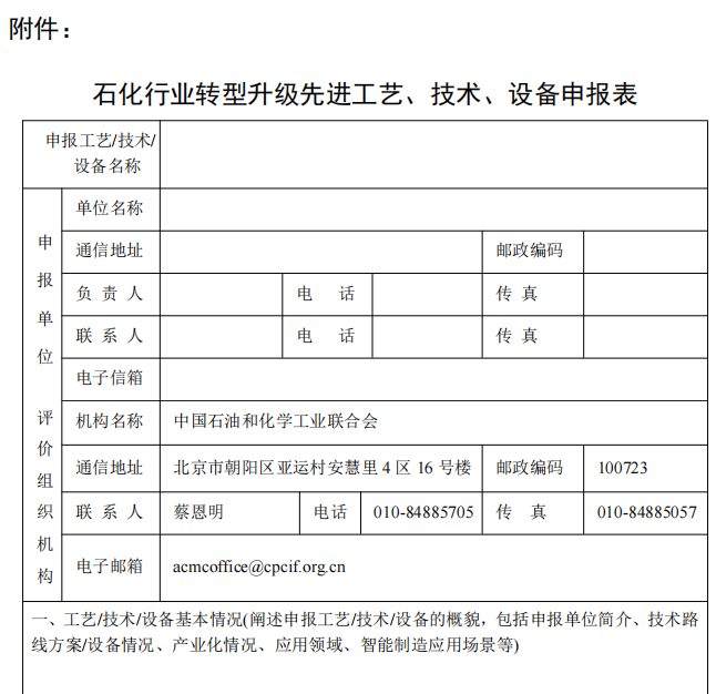 为贯彻落实党的二十届三中全会关于建设现代化产业体系的指示精神,推动资源节约、绿色低碳、本质安全、数字化和智能化等先进工艺、技术及设备在石化行业的推广和应用,促进石化行业高端化、绿色化、智能化发展,加快建设石化强国,我会启动了石化行业转型升级先进工艺、技术、设备的征集遴选工作,经过评审将编制形成《石化行业转型升级先进工艺、技术、设备名录》向全行业发布和宣介,支撑石化行业转型升级和高质量发展。现面向全行业公开征集符合条件的工艺、技术、设备,欢迎有关单位踊跃申报。(一)申报单位应具有独立法人资格,或得到具有独立法人资格的上级单位授权,3年内未发生重大安全环保事故且无不良信用记录;(二)申报工艺、技术、设备应符合相关产业政策要求,实现产业化并稳定运行1年以上;(三)申报工艺、技术、设备的知识产权权属明晰,属于多家单位共有知识产权的,申报单位应征得共有单位的一致同意;(四)申报工艺、技术、设备应符合以下方向,且易于在石化行业内推广应用:1.质量提升:提高产品质量和性能,满足下游领域高端需求,开发新的应用领域,填补国内空白。2.节能低碳:采用清洁能源替代传统能源,提高能源利用效率,降低单位产品能源消耗,减少二氧化碳产生与排放。3.绿色环保:减少重点污染物产生与排放,提高低品位资源和废弃资源利用水平,降低“三废”处置成本和治理难度。4.智能制造:提高研发设计、生产作业、产品质量、排碳管理、安全环保、供应链等环节的智能化水平,降低生产成本。5.本质安全:提高安全保障能力,降低安全风险隐患。(五)申报企业应提供与传统工艺、技术、设备的对比分析,重点是生产成本、运营效率、产品质量、能源和原材料消耗、“三废”及二氧化碳排放、清洁能源替代、有毒有害原料减量等定量分析;(六)申报工艺、技术、设备的名称应清晰、简短、准确,不能以先进、新型、绿色等非技术性词汇进行笼统性描述。(一)《石化行业转型升级先进工艺、技术、设备申报表》(见附件,请提供WORD和盖章PDF两个版本)。(三)具有相关资质的第三方机构出具的技术性能、产品质量检测报告,技术评估报告、验收报告、获奖证明等技术资料。请申报单位于2025年3月10日前将申报材料反馈至我会产业发展部。联系方式:010-84885306 010-84885705 010-84885140刘金沅 13898384577 蔡恩明 13681345904杨传玮 13810899953 马新明 13699169591